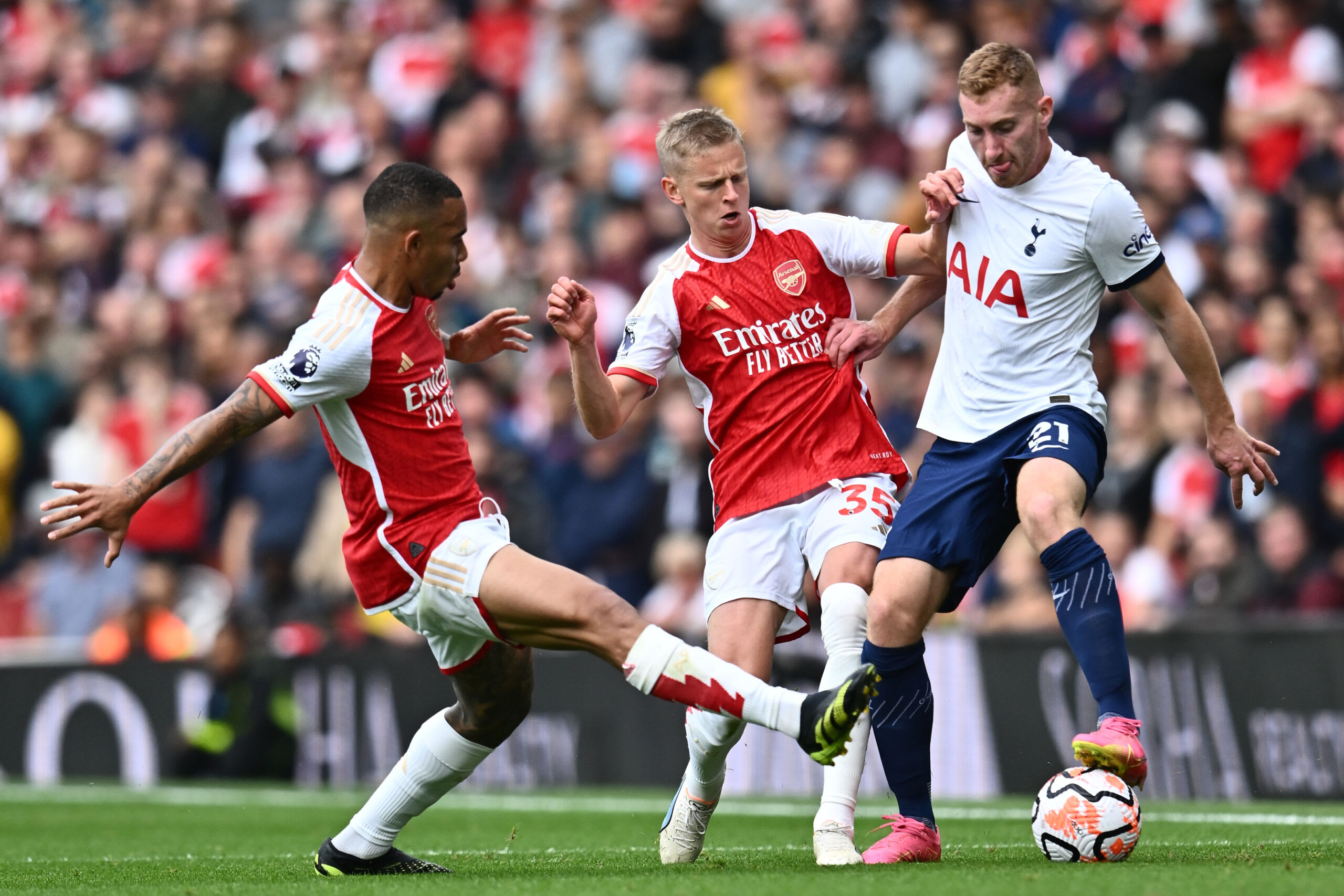 Arsenal's English midfielder #07 Bukayo Saka celebrates with supporters after scoring their second goal from the penalty spot during the English Premier League football match between Arsenal and Tottenham Hotspur at the Emirates Stadium in London on September 24, 2023. (Photo by HENRY NICHOLLS / AFP) / RESTRICTED TO EDITORIAL USE. No use with unauthorized audio, video, data, fixture lists, club/league logos or 'live' services. Online in-match use limited to 120 images. An additional 40 images may be used in extra time. No video emulation. Social media in-match use limited to 120 images. An additional 40 images may be used in extra time. No use in betting publications, games or single club/league/player publications. / (Photo by HENRY NICHOLLS/AFP via Getty Images)