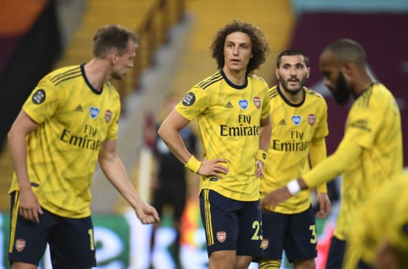 BIRMINGHAM, ENGLAND – JULY 21: David Luiz of Arsenal reacts with his team during the Premier League match between Aston Villa and Arsenal FC at Villa Park on July 21, 2020 in Birmingham, England. Football Stadiums around Europe remain empty due to the Coronavirus Pandemic as Government social distancing laws prohibit fans inside venues resulting in all fixtures being played behind closed doors. (Photo by Peter Powell/Pool via Getty Images)