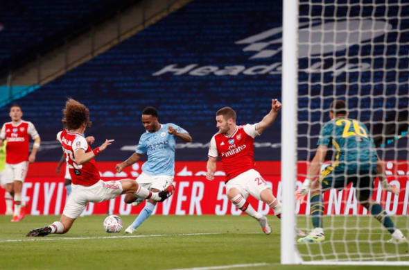 Arsenal’s Brazilian defender David Luiz (L) jumps across to block Manchester City’s English midfielder Raheem Sterling (C) during the English FA Cup semi-final football match between Arsenal and Manchester City at Wembley Stadium in London, on July 18, 2020. (Photo by MATTHEW CHILDS / POOL / AFP) / NOT FOR MARKETING OR ADVERTISING USE / RESTRICTED TO EDITORIAL USE (Photo by MATTHEW CHILDS/POOL/AFP via Getty Images)