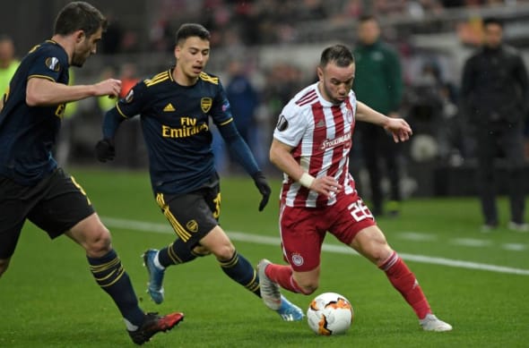 Olympiakos’ French midfielder Mathieu Valbuena (R) vies with Arsenal’s Greek defender Sokratis Papastathopoulos (L) and Arsenal’s Brazilian striker Gabriel Martinelli (C) during the UEFA Europa League round of 32 first leg football match between Olympiakos and Arsenal at the Karaiskakis Stadium in Piraeus, near Athens, on February 20, 2020. (Photo by LOUISA GOULIAMAKI / AFP) (Photo by LOUISA GOULIAMAKI/AFP via Getty Images)