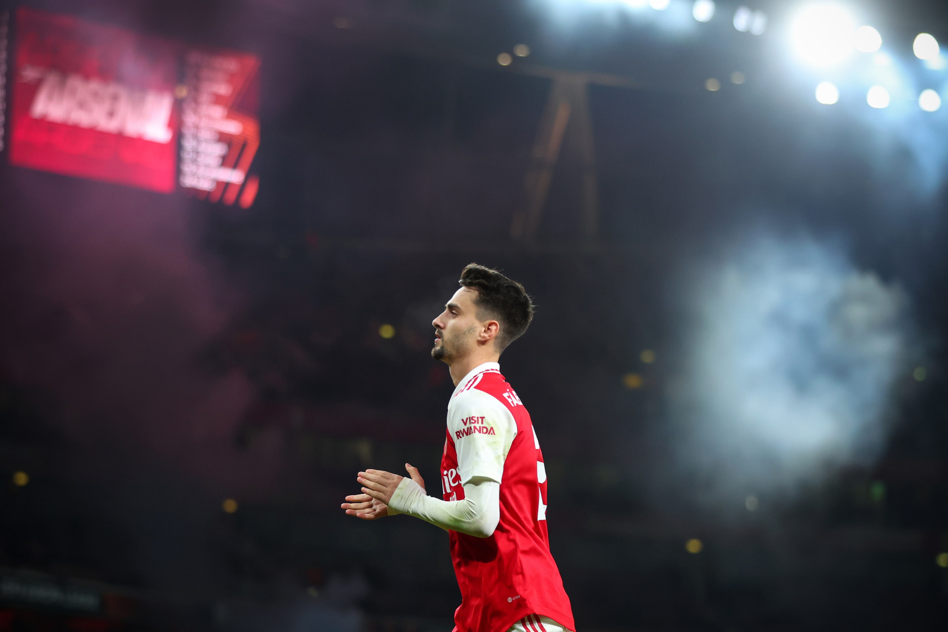 LONDON, ENGLAND - MARCH 16: Fabio Vieira of Arsenal pointing during the UEFA Europa League round of 16 leg two match between Arsenal FC and Sporting CP at Emirates Stadium on March 16, 2023 in London, England. (Photo by Nigel French/Sportsphoto/Allstar via Getty Images)