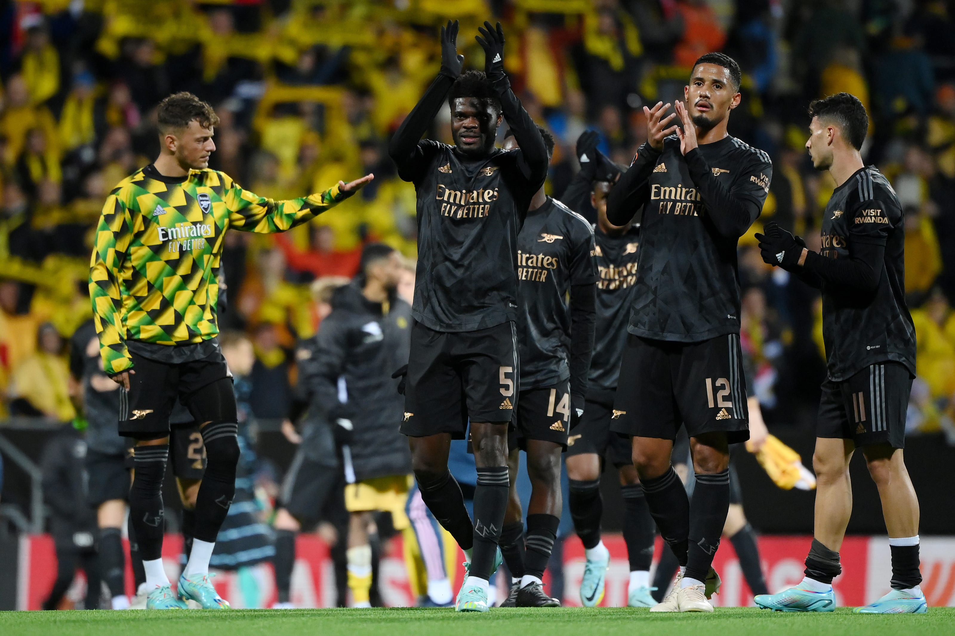 BODO, NORWAY - OCTOBER 13: Thomas Partey and William Saliba of Arsenal applauds their fans after the final whistle of the UEFA Europa League group A match between FK Bodo/Glimt and Arsenal FC at Aspmyra Stadion on October 13, 2022 in Bodo, Norway. (Photo by David Lidstrom/Getty Images)