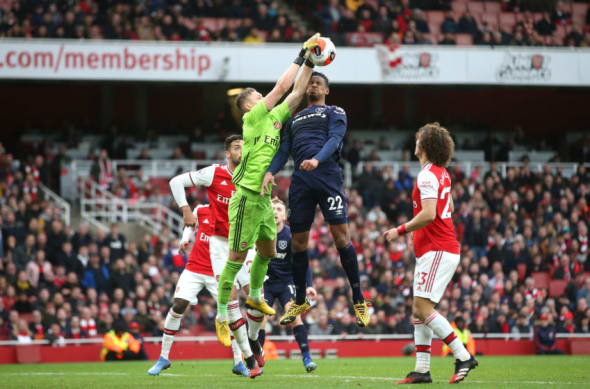 LONDON, ENGLAND – MARCH 07: Bernd Leno of Arsenal saves a header from Sebastien Haller of West Ham United during the Premier League match between Arsenal FC and West Ham United at Emirates Stadium on March 07, 2020 in London, United Kingdom. (Photo by Alex Morton/Getty Images)