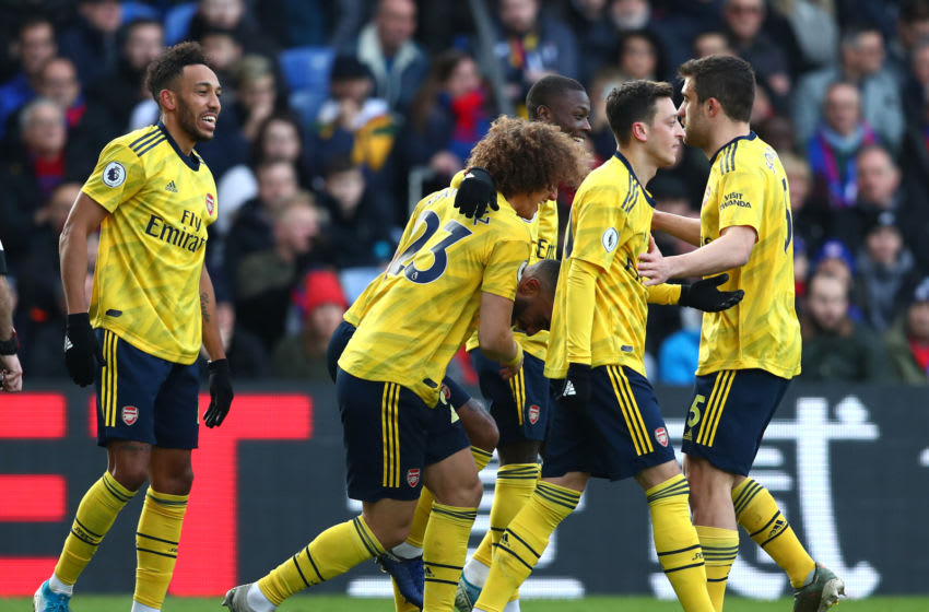 LONDON, ENGLAND – JANUARY 11: Pierre-Emerick Aubameyang of Arsenal celebrates with teammates after scoring his team’s first goal during the Premier League match between Crystal Palace and Arsenal FC at Selhurst Park on January 11, 2020 in London, United Kingdom. (Photo by Dan Istitene/Getty Images)