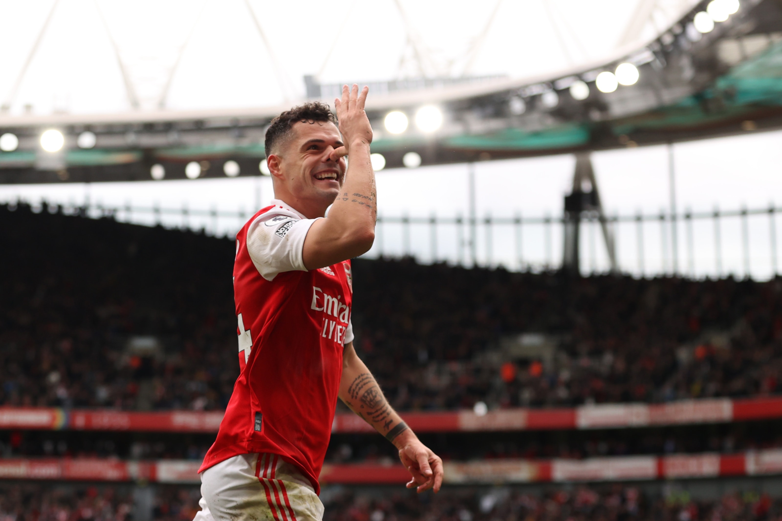 Arsenal's English midfielder Bukayo Saka (2R) celebrates with teammates after scoring their fourth goal during the English Premier League football match between Arsenal and Crystal Palace at the Emirates Stadium in London on March 19, 2023. (Photo by JUSTIN TALLIS / AFP) / RESTRICTED TO EDITORIAL USE. No use with unauthorized audio, video, data, fixture lists, club/league logos or 'live' services. Online in-match use limited to 120 images. An additional 40 images may be used in extra time. No video emulation. Social media in-match use limited to 120 images. An additional 40 images may be used in extra time. No use in betting publications, games or single club/league/player publications. / (Photo by JUSTIN TALLIS/AFP via Getty Images)