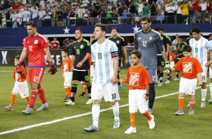 Sep 8, 2015; Arlington, TX, USA; Argentina forward Lionel Messi (10) is lead unto the field by a young soccer player prior to the game against Mexico at AT&T Stadium. Mandatory Credit: Matthew Emmons-USA TODAY Sports