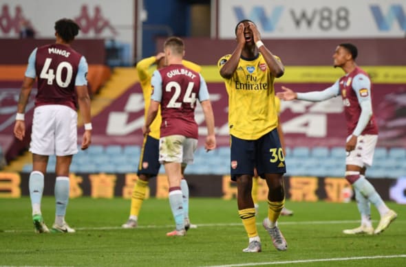 BIRMINGHAM, ENGLAND – JULY 21: Eddie Nketiah of Arsenal shows frustration during the Premier League match between Aston Villa and Arsenal FC at Villa Park on July 21, 2020 in Birmingham, England. Football Stadiums around Europe remain empty due to the Coronavirus Pandemic as Government social distancing laws prohibit fans inside venues resulting in all fixtures being played behind closed doors. (Photo by Shaun Botterill/Getty Images)