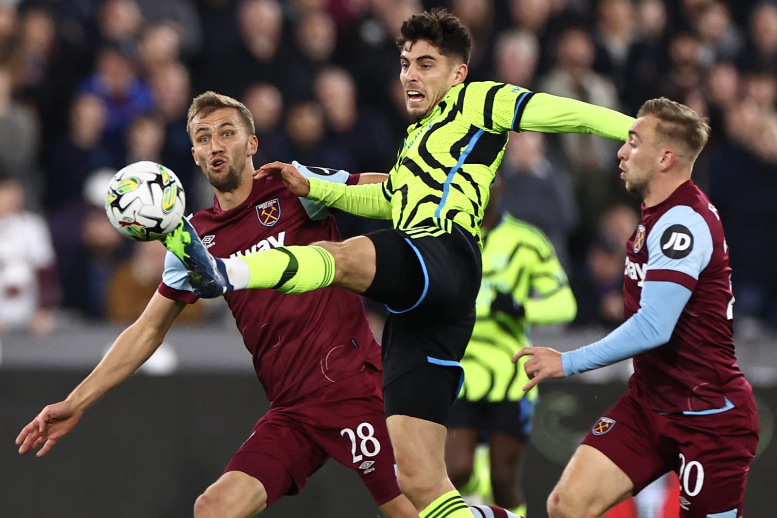 Arsenal’s German midfielder #29 Kai Havertz (C) vies with West Ham United’s Czech midfielder #28 Tomas Soucek (L) and West Ham United’s English striker #20 Jarrod Bowen (R) during the English League Cup fourth round football match between West Ham United and Arsenal at The London Stadium, in east London, on November 1, 2023. (Photo by HENRY NICHOLLS / AFP) / RESTRICTED TO EDITORIAL USE. No use with unauthorized audio, video, data, fixture lists, club/league logos or ‘live’ services. Online in-match use limited to 120 images. An additional 40 images may be used in extra time. No video emulation. Social media in-match use limited to 120 images. An additional 40 images may be used in extra time. No use in betting publications, games or single club/league/player publications. / (Photo by HENRY NICHOLLS/AFP via Getty Images)